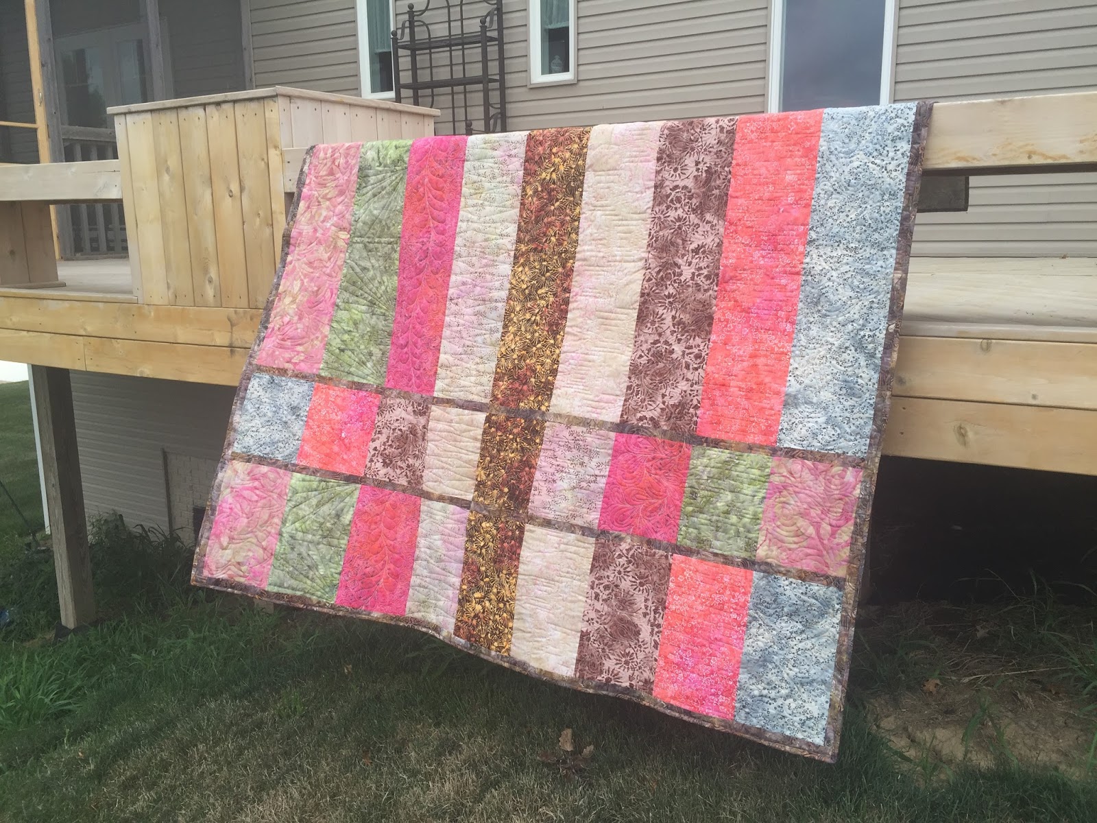This is a pattern from a magazine, although I can't recall which one just now. Very simple, but I had recently purchased a bundle of batiks and it seemed a great fit. I loaded it onto the machine sideways, and did a different quilting motif in each band. Feathers, loops, straight lines, I had some fun with them!